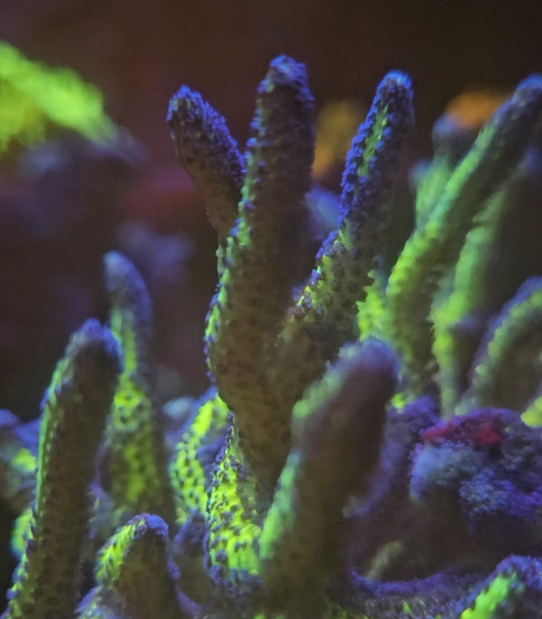 Bright, bold, and full of movement — the Birds of Paradise Seriatopora is a show-stopping SPS that brings electric color and branching texture to any reef. Its vibrant neon-green polyps glow intensely under blue lighting, while the deep purple branches create a dramatic contrast that pulls your eyes in from across the room.